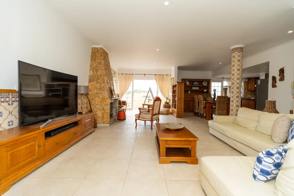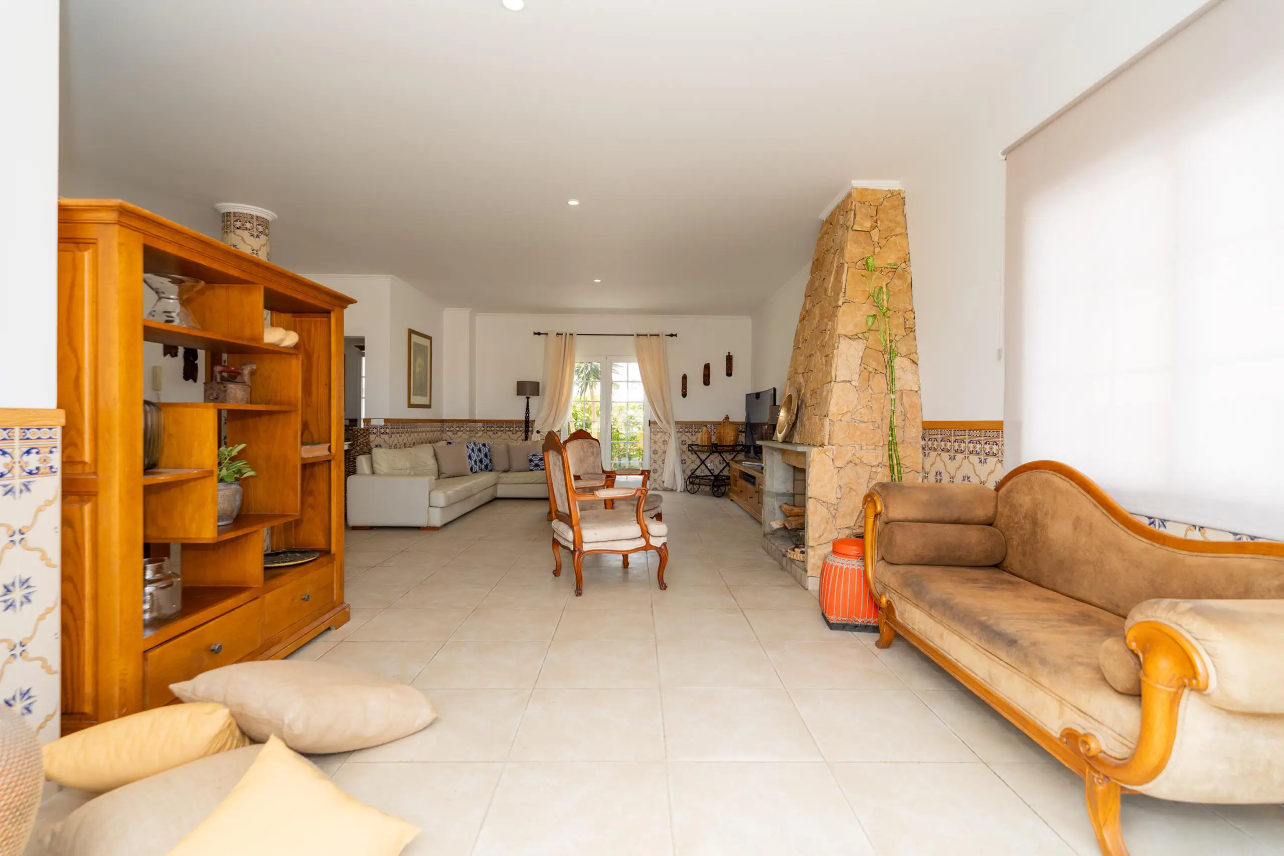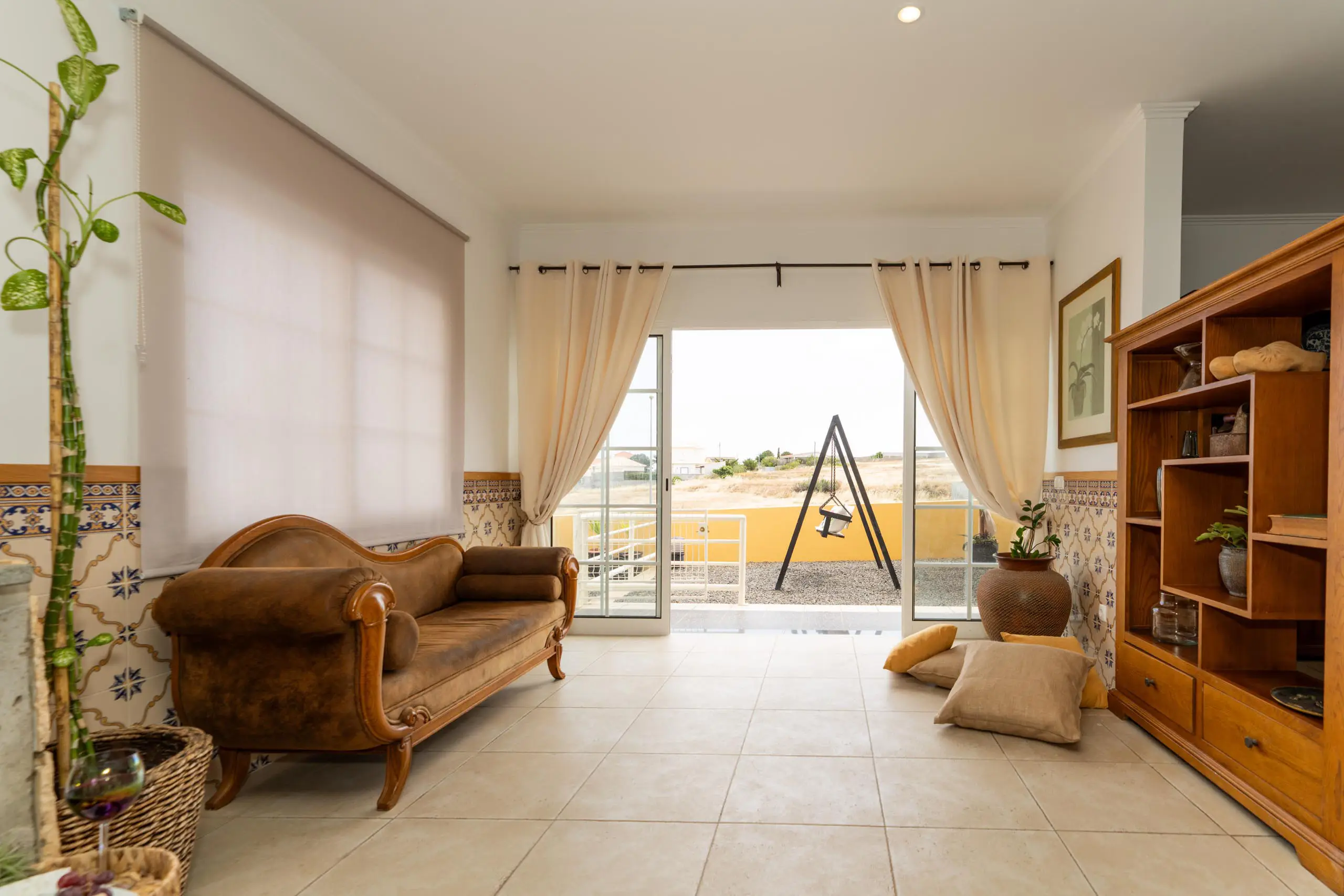 The lounge area features plush, comfortable seating arranged for conversation and connection with soft lighting adding depth and coziness. Large windows and sliding doors are a big feature of the property bringing natural light during the day.